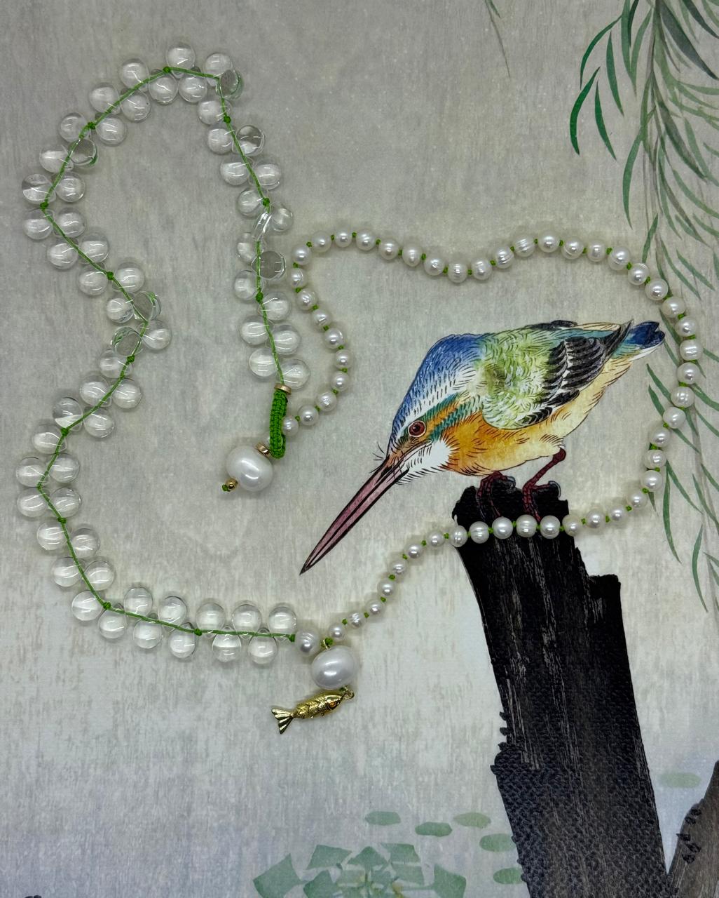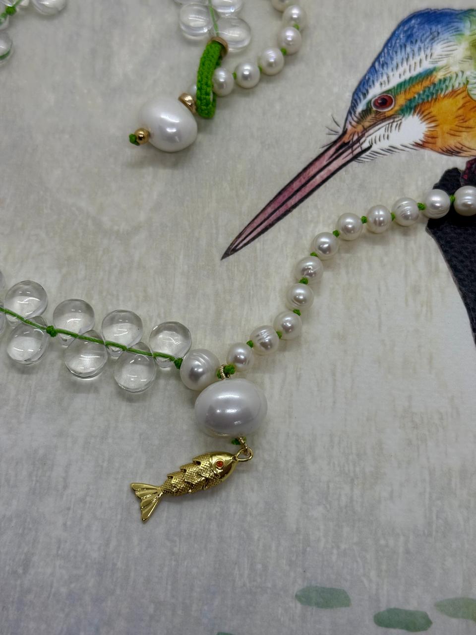 Adorned with an 18-karat gold-plated fish pendant, complete with a striking ruby eye, symbolising vitality and movement