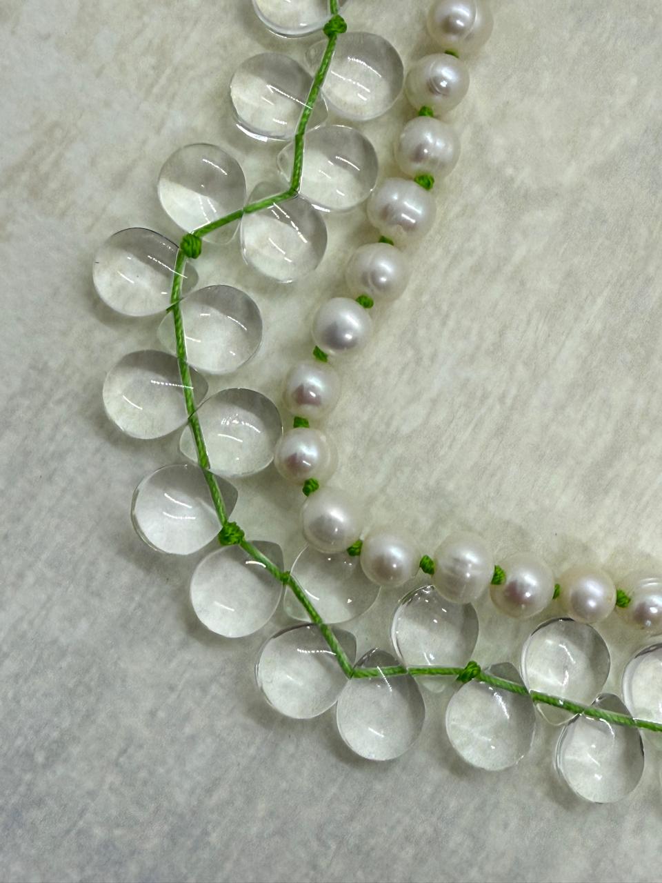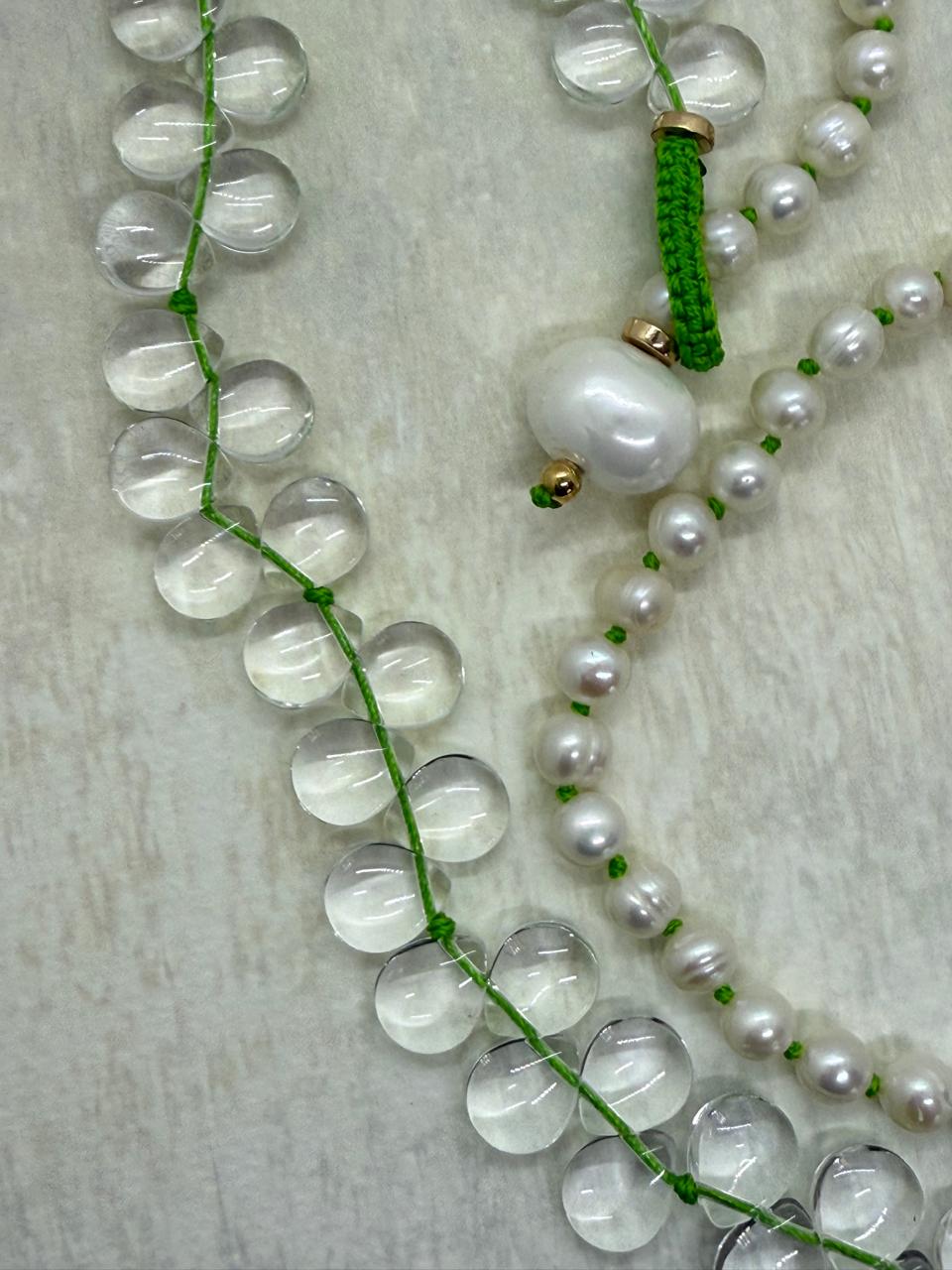 Merano glass teardrops , delicately crafted to resemble shimmering fish tears, are paired with lustrous white freshwater pearls for a soft, elegant touch.
