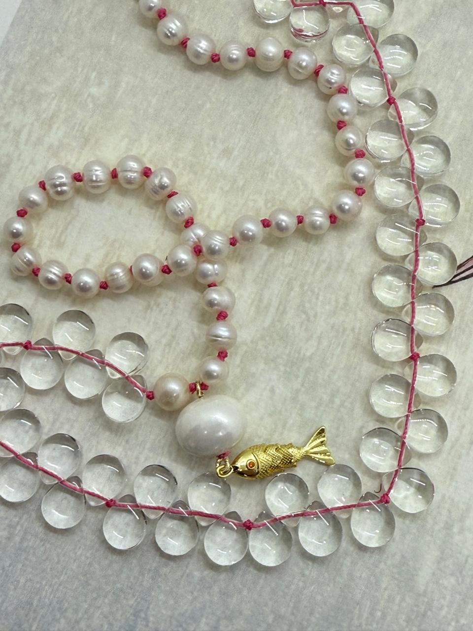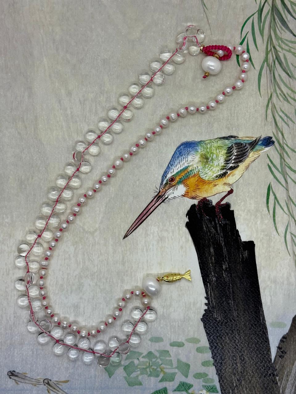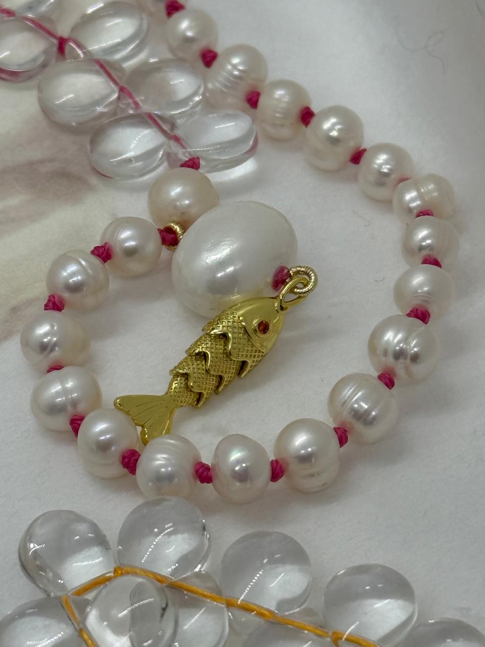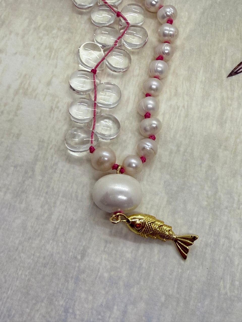 Adorned with an 18-karat gold-plated fish pendant, complete with a striking ruby eye, symbolising vitality and movement