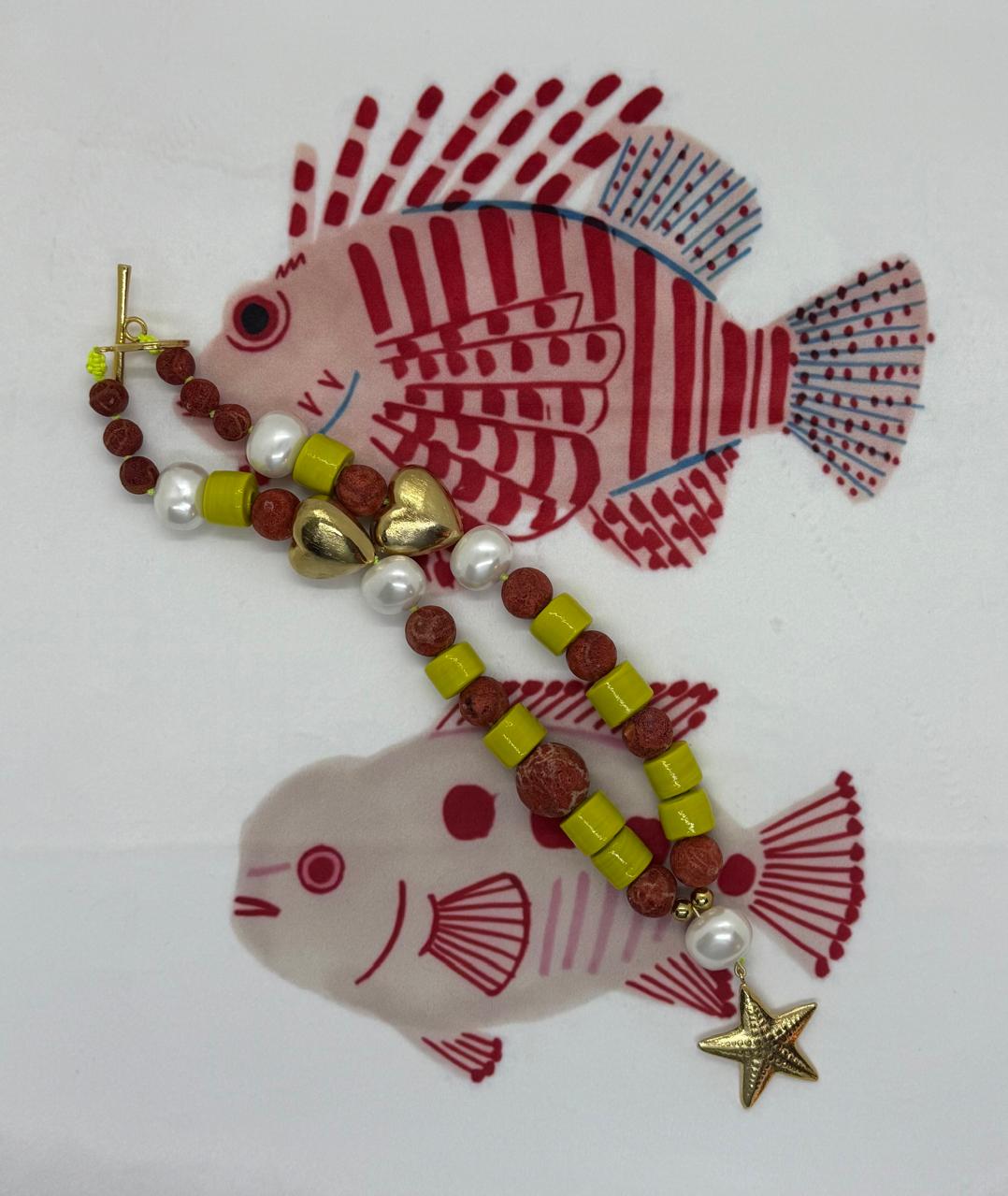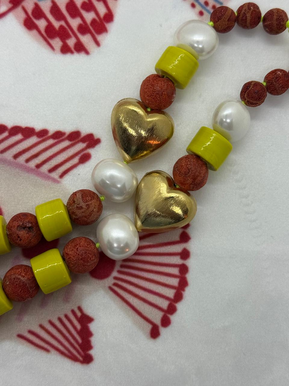 A string of warm Malawian yellow clay beads paired with real bamboo coral for earthy richness.