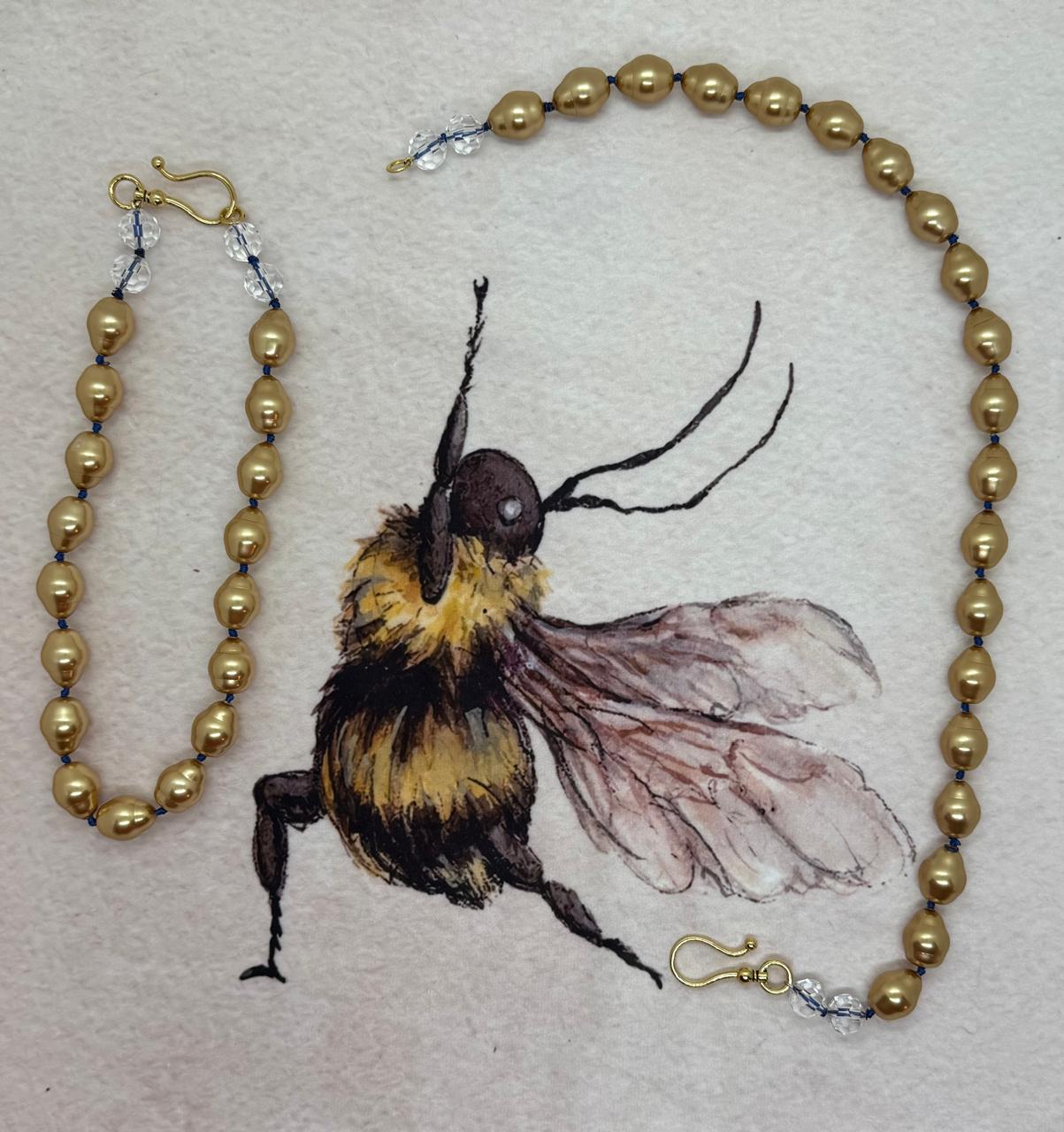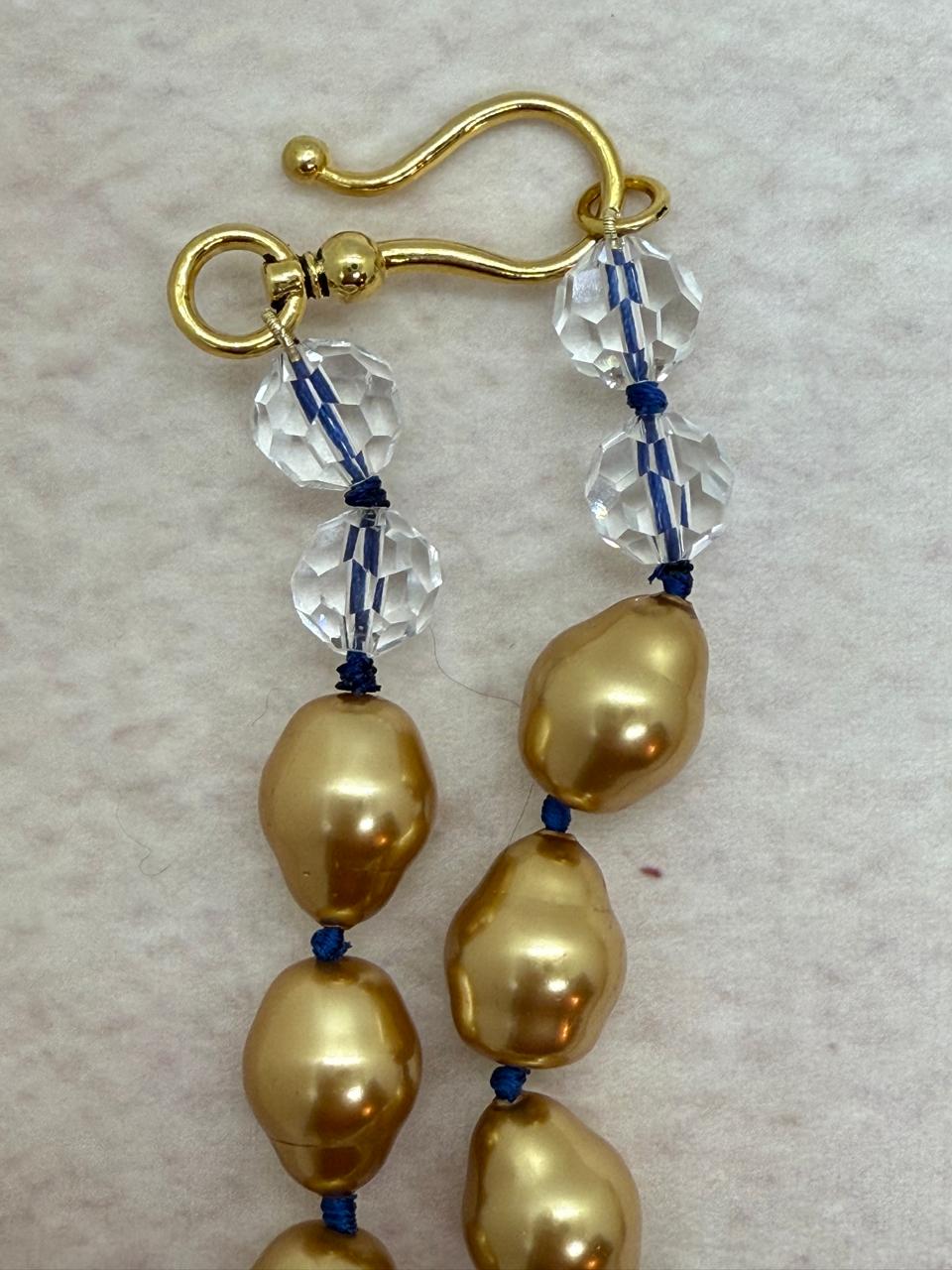 Gold sea shell pearls, luminous and striking, knotted in vibrant blue denim cotton thread for a modern, chic contrast.