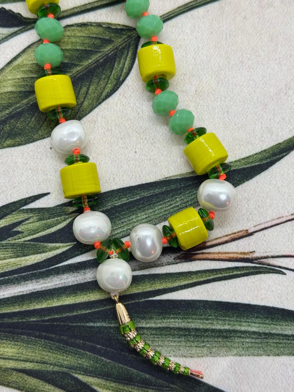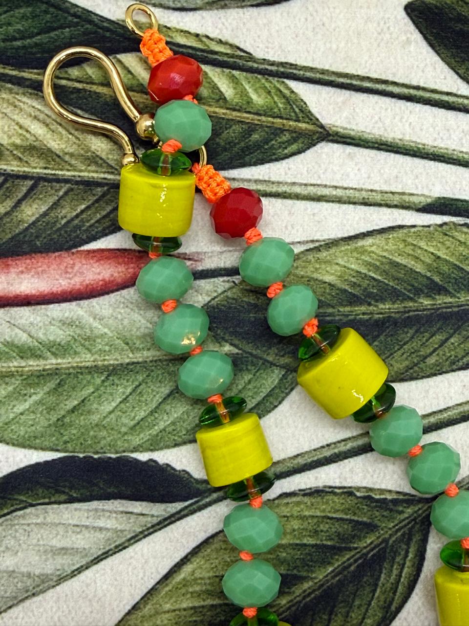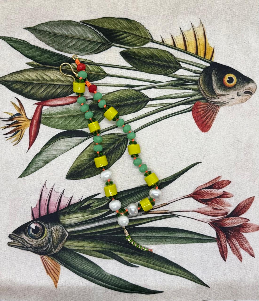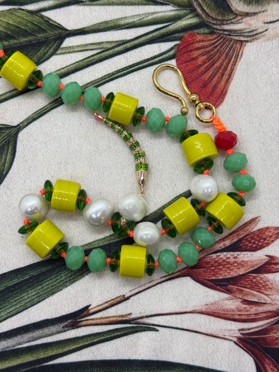 A lively combination of Malawian yellow glass beads and sparkling granny-green crystals.