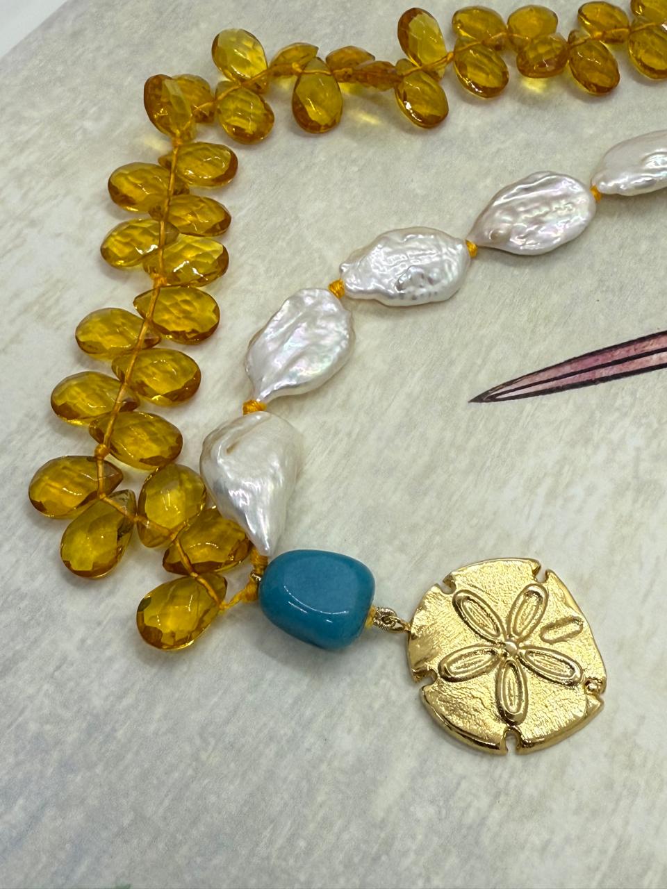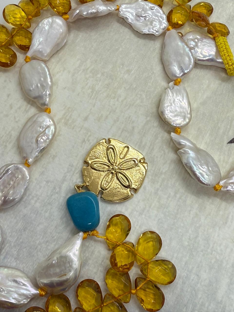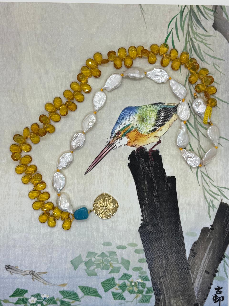 Accented with delicate Murano amber glass teardrops, capturing rich, golden hues and shimmer.