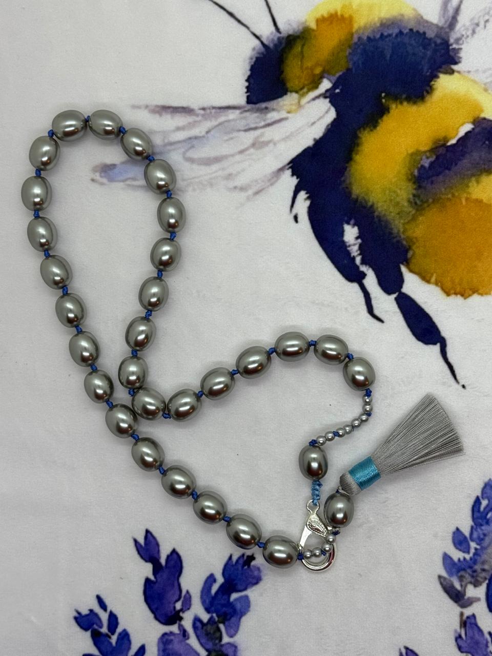A single strand of luminous silver sea shell pearls combined with denim cotton thread creates a sophisticated, textured look.